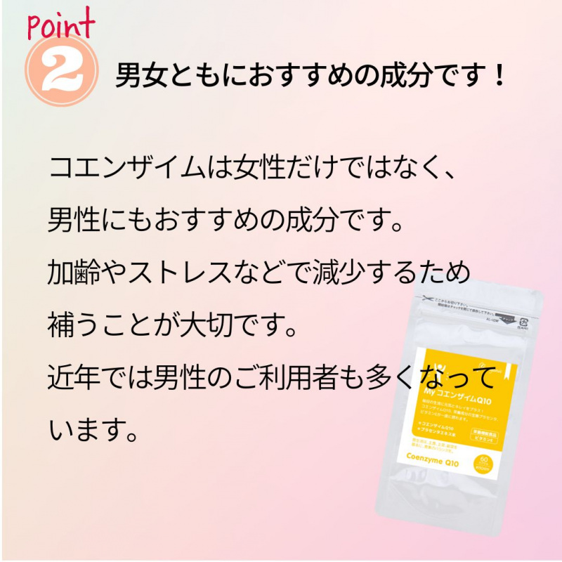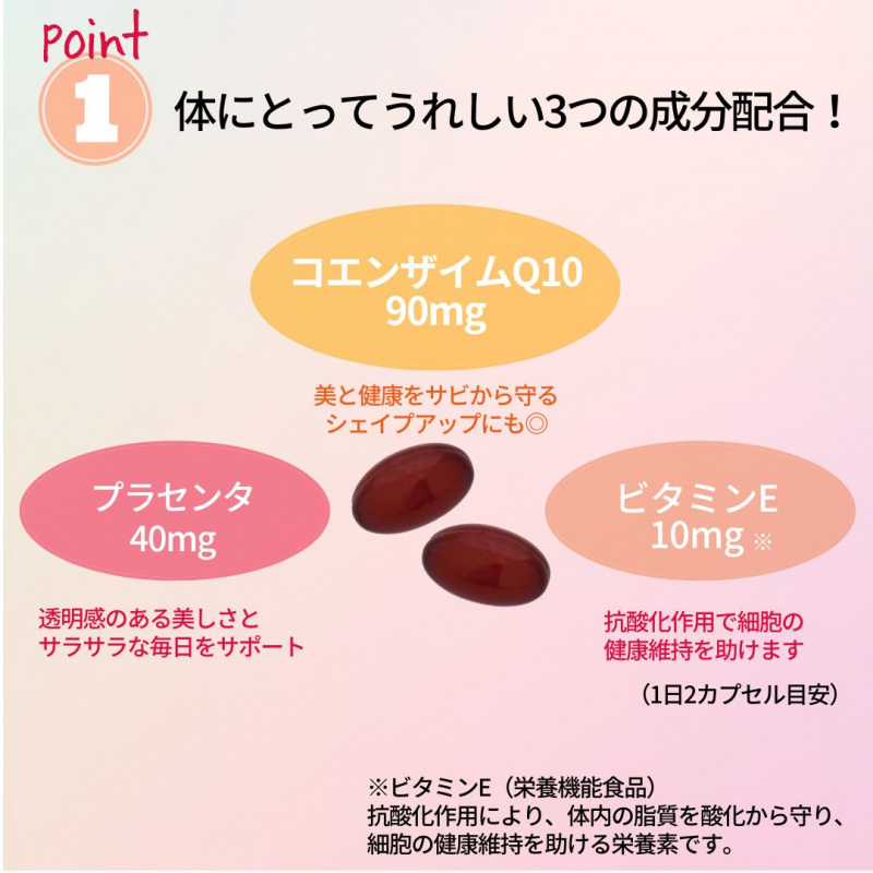 | 主な成分 2カプセル中 | コエンザイムQ10 90㎎ 豚プラセンタエキス末40mg 黒胡椒エキス末2mg ビタミンE10mg |
